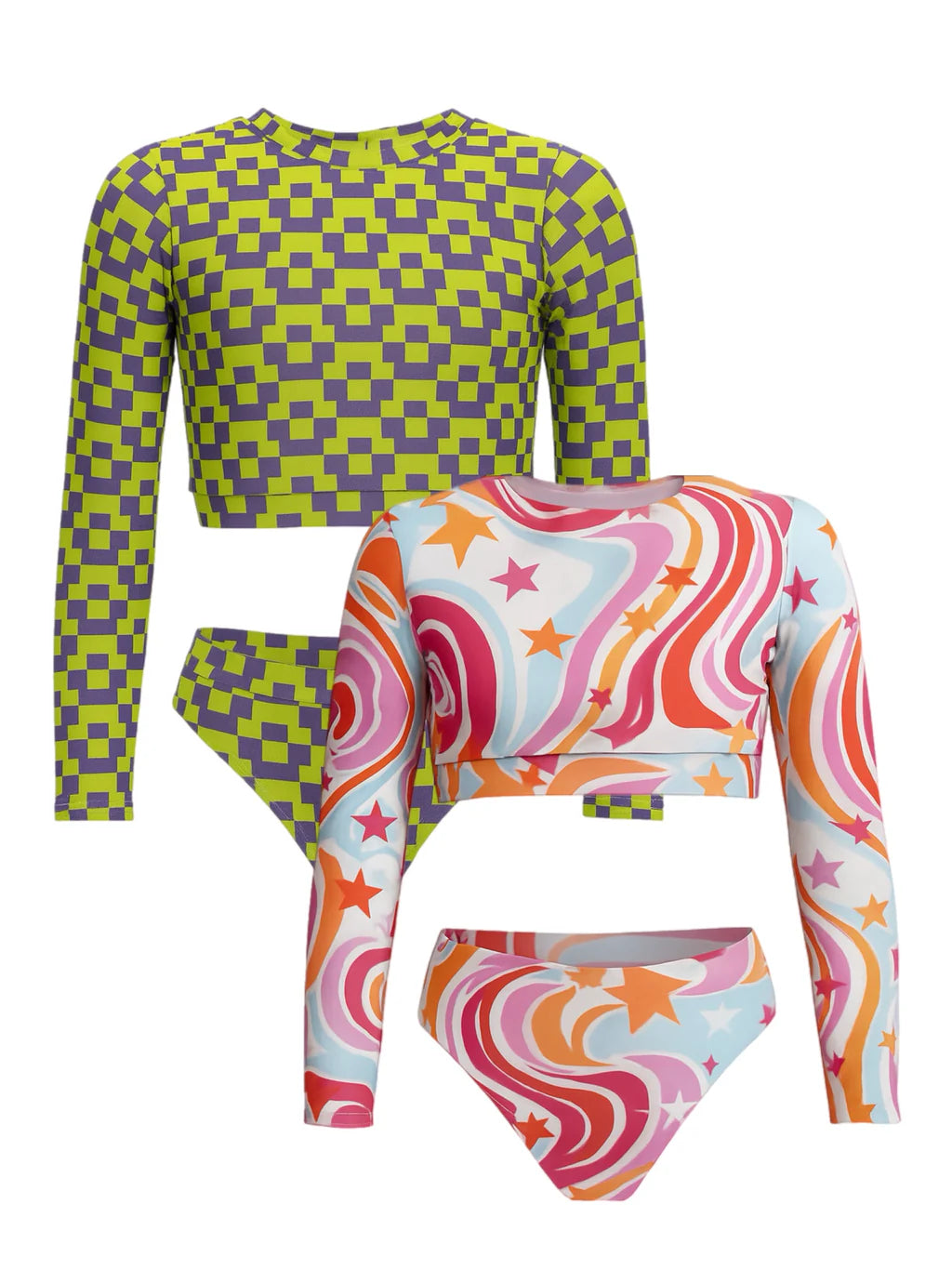 Bold. Geometric. Unstoppable. The Zeon is a standout reversible long-sleeve bikini designed for kids who want to play hard while staying sun-safe. Featuring an electric lime and deep violet square pattern on one side and a vibrant star-swirled retro print on the other, this bikini offers two unique looks in one.