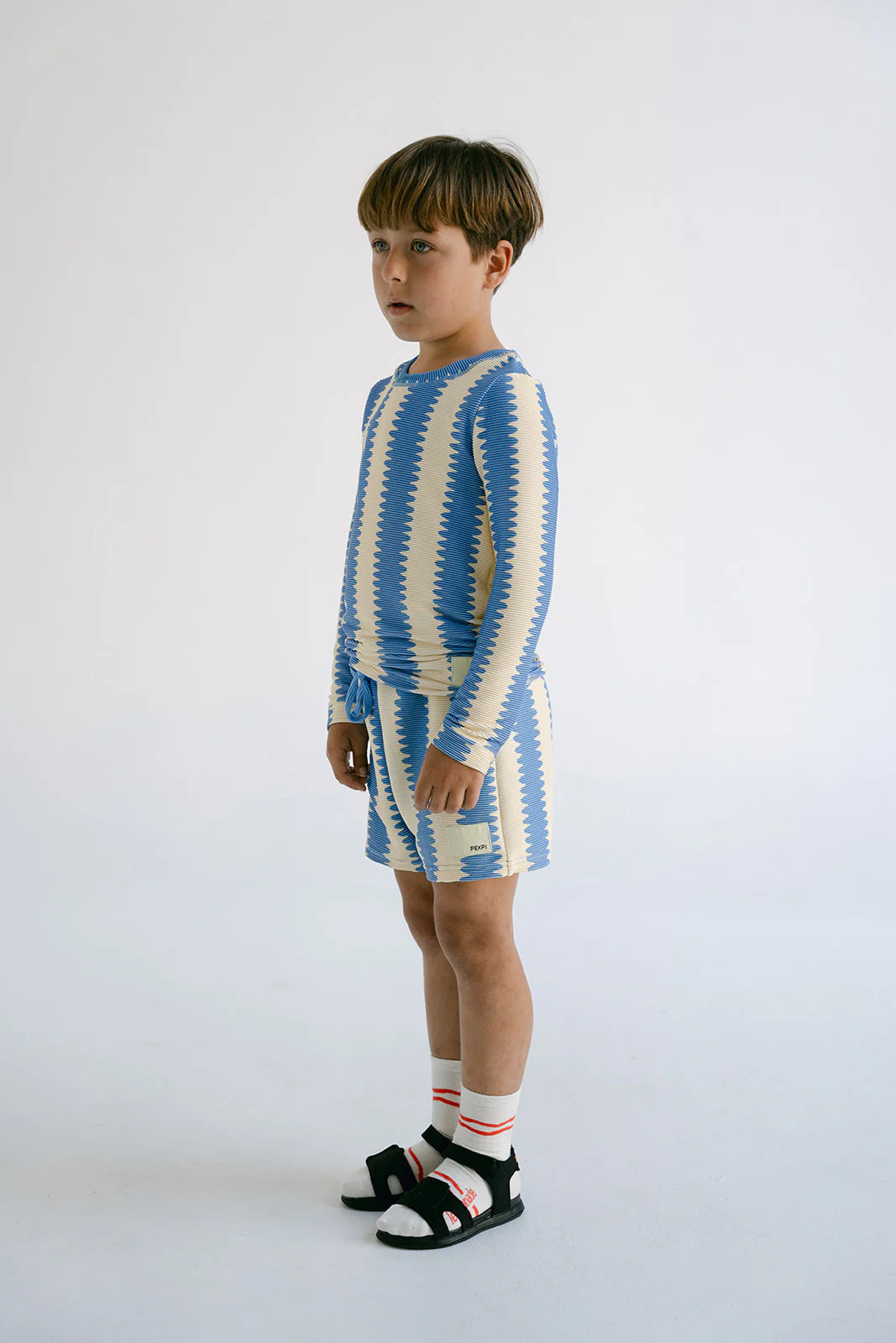 Get your little one ready for summer with these vibrant swim shorts. Featuring a playful blue wobble stripe print on a ribbed fabric, these swim trunks add a splash of fun to pool or beach days. Crafted from high-quality, ribbed recycled material, it combines comfort with eco-friendliness.
