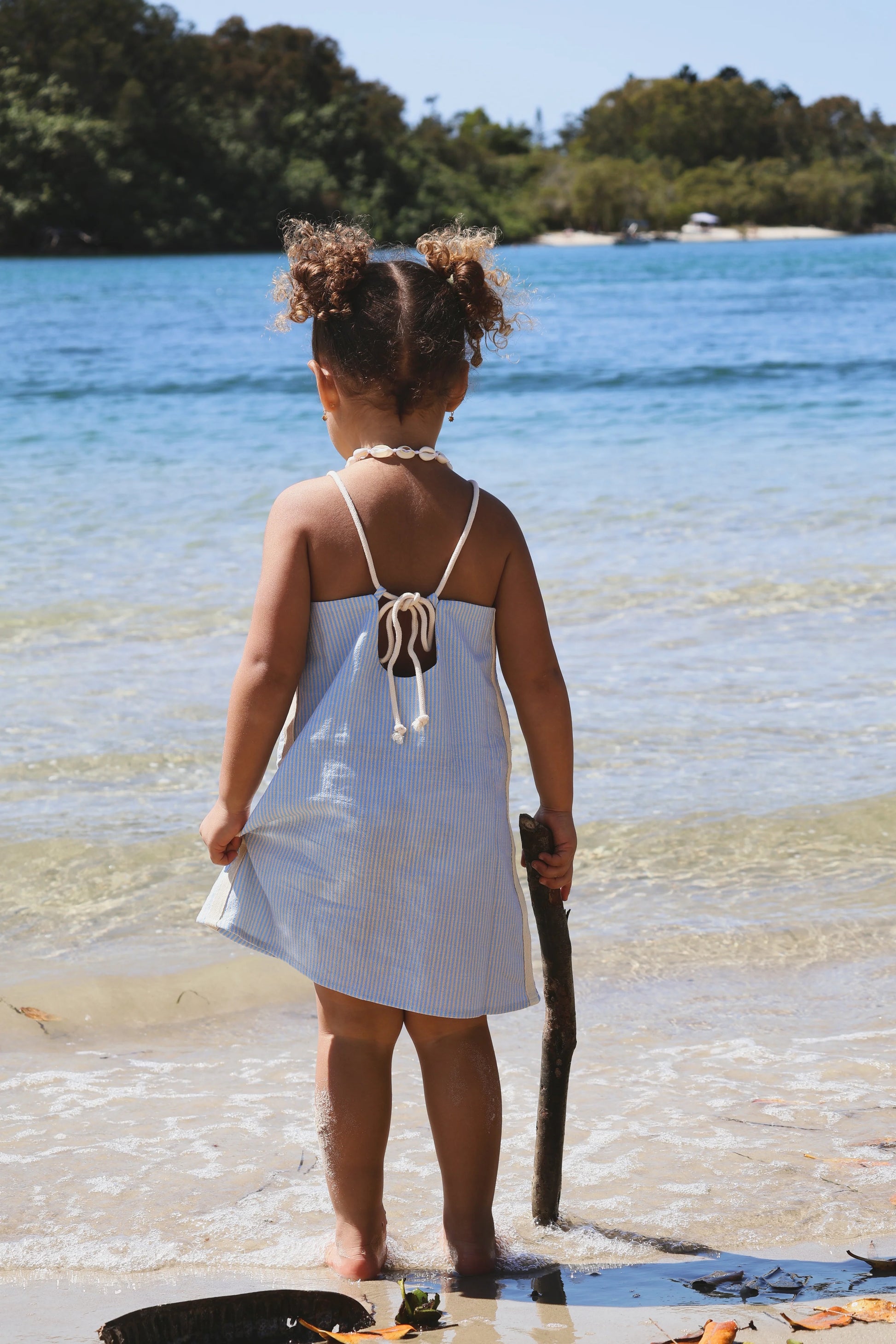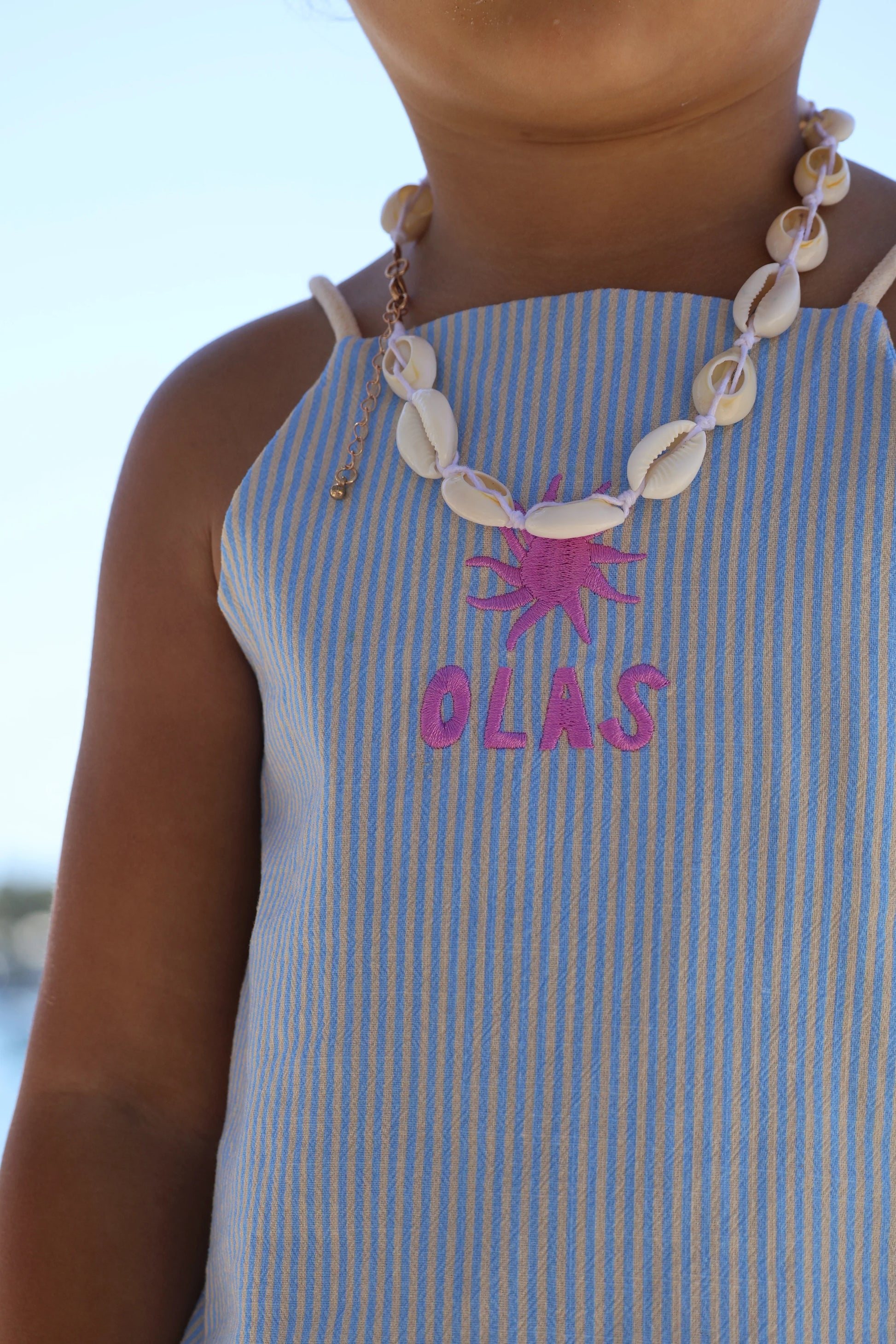 Breezy and ready for adventure. The Seeker Mini Dress features playful Olas embroidery at the front and a fun tie-up back. Perfect for sunny days, beach trips, and summer fun.