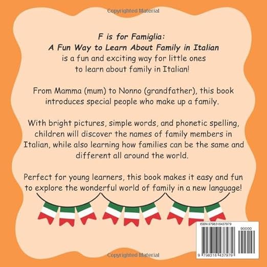 F is for Famiglia: A Fun Way to Learn About Family in Italian is a fun and exciting way for little ones to learn about family in Italian! From Mamma (mum) to Nonno (grandfather), this book introduces special people who make up a family.