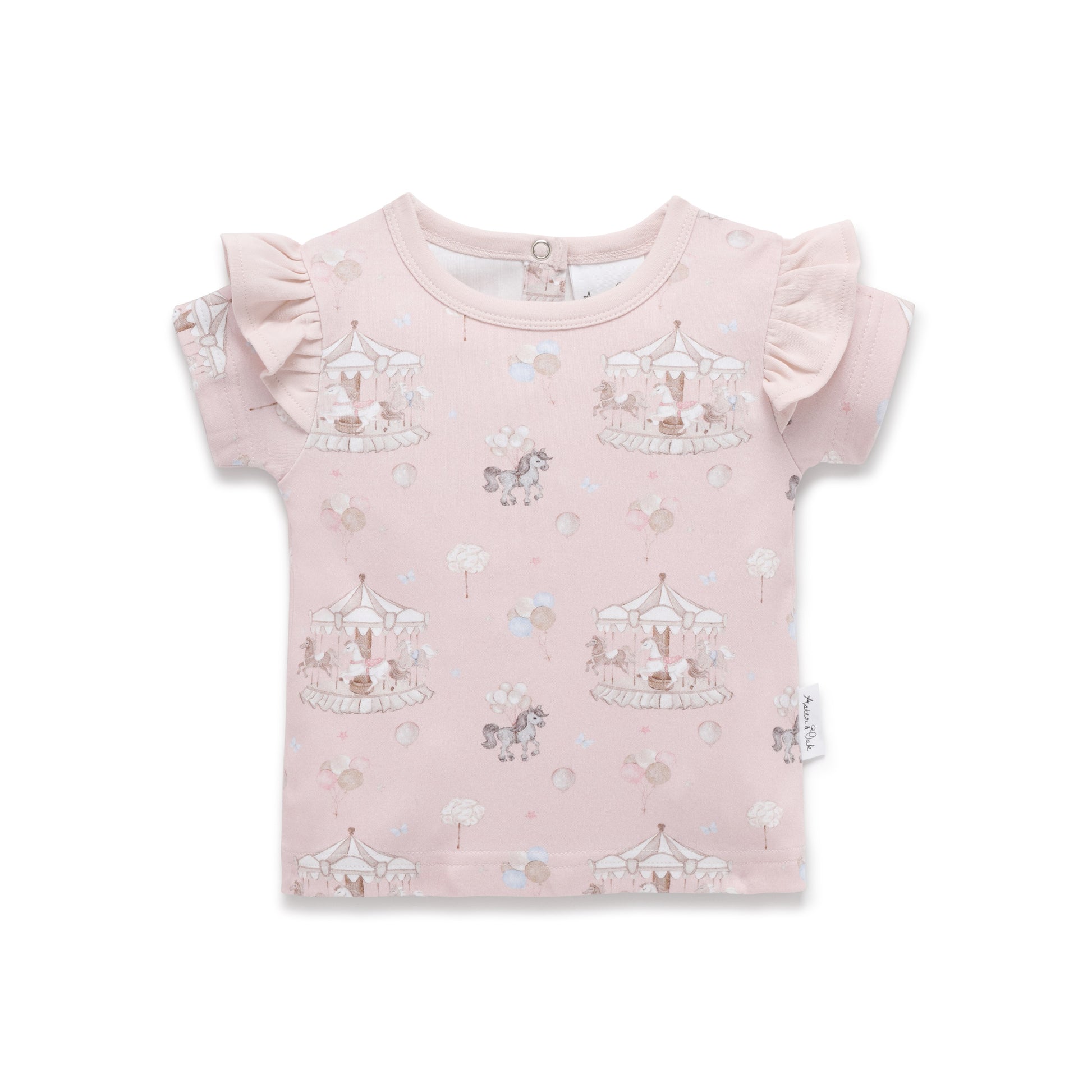 Made from GOTS certified organic cotton, this classic short sleeve pink tee features an all over print of ponies, carousels, and balloons and with ruffle shoulder detail. 100% Certified organic cotton #USB008294. Made in India. Wash according to care instructions.