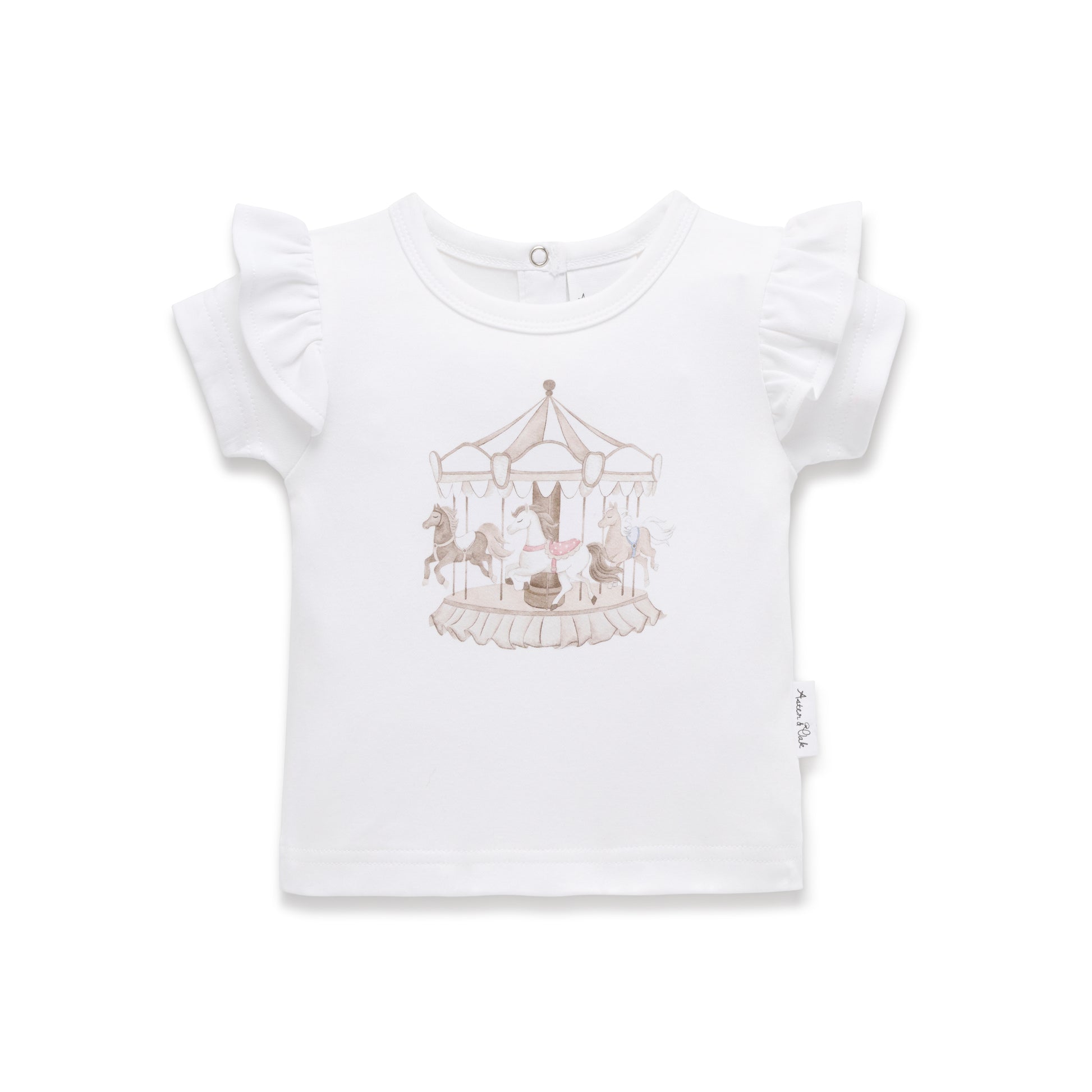 Made from GOTS certified organic cotton, this classic short sleeve tee with frill to shoulder features a pony carousel in soft colours as a central print. 100% Certified organic cotton #USB008294. Made in India. Wash according to care instructions.