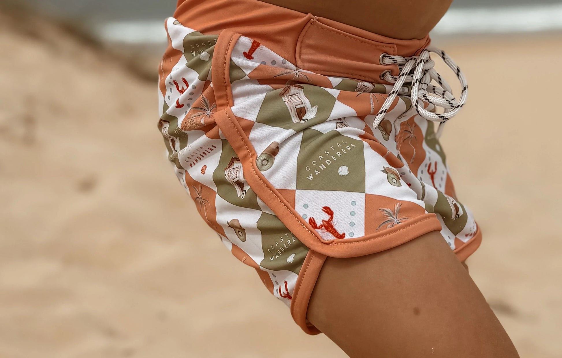 Dive into summer vibes with the Coastal Cabana Swim Shorts, featuring a retro-inspired check design in olive and peach. Decorated with coastal icons — palm trees, seagulls, lobsters, surf shacks & palms these shorts are made for sandy toes, salty swims, and endless beach hangs.