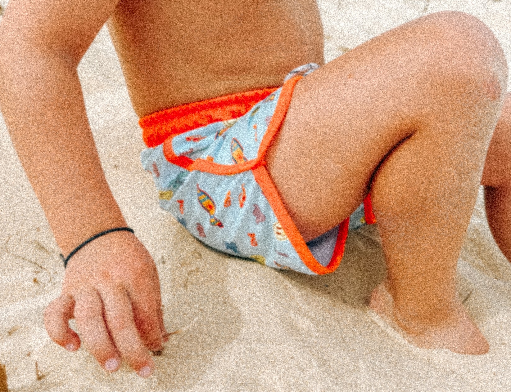 Turn up the summer vibes with the Salty Grom Swim Shorts, splashed in bold, retro prints made for little wave chasers. Featuring smiley faces, surfboards, sunnies, palms and more, these shorts bring pure 80s 90s beach energy.