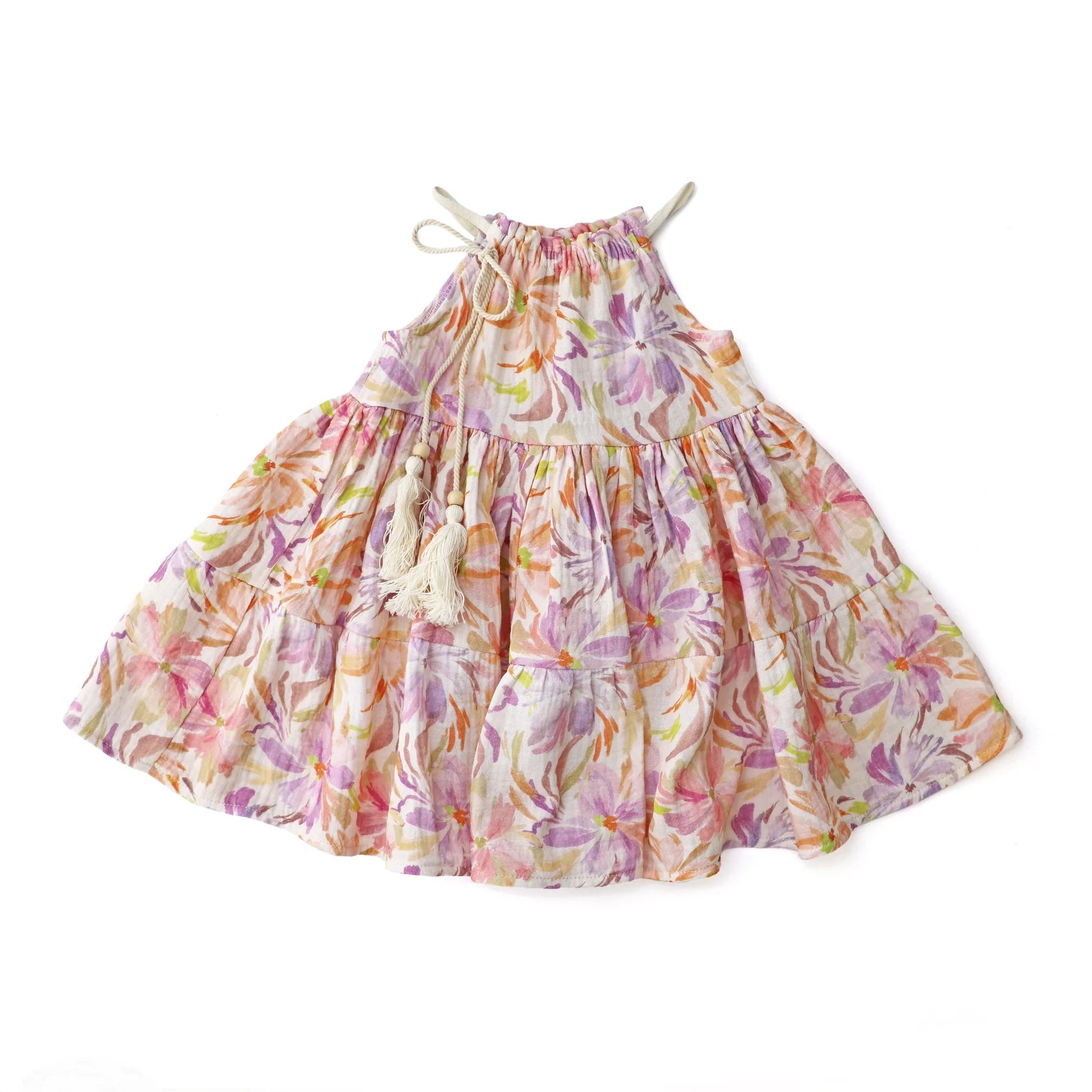 Soft cotton muslin 3 tiered dress with gorgeous tassel and beaded detail.