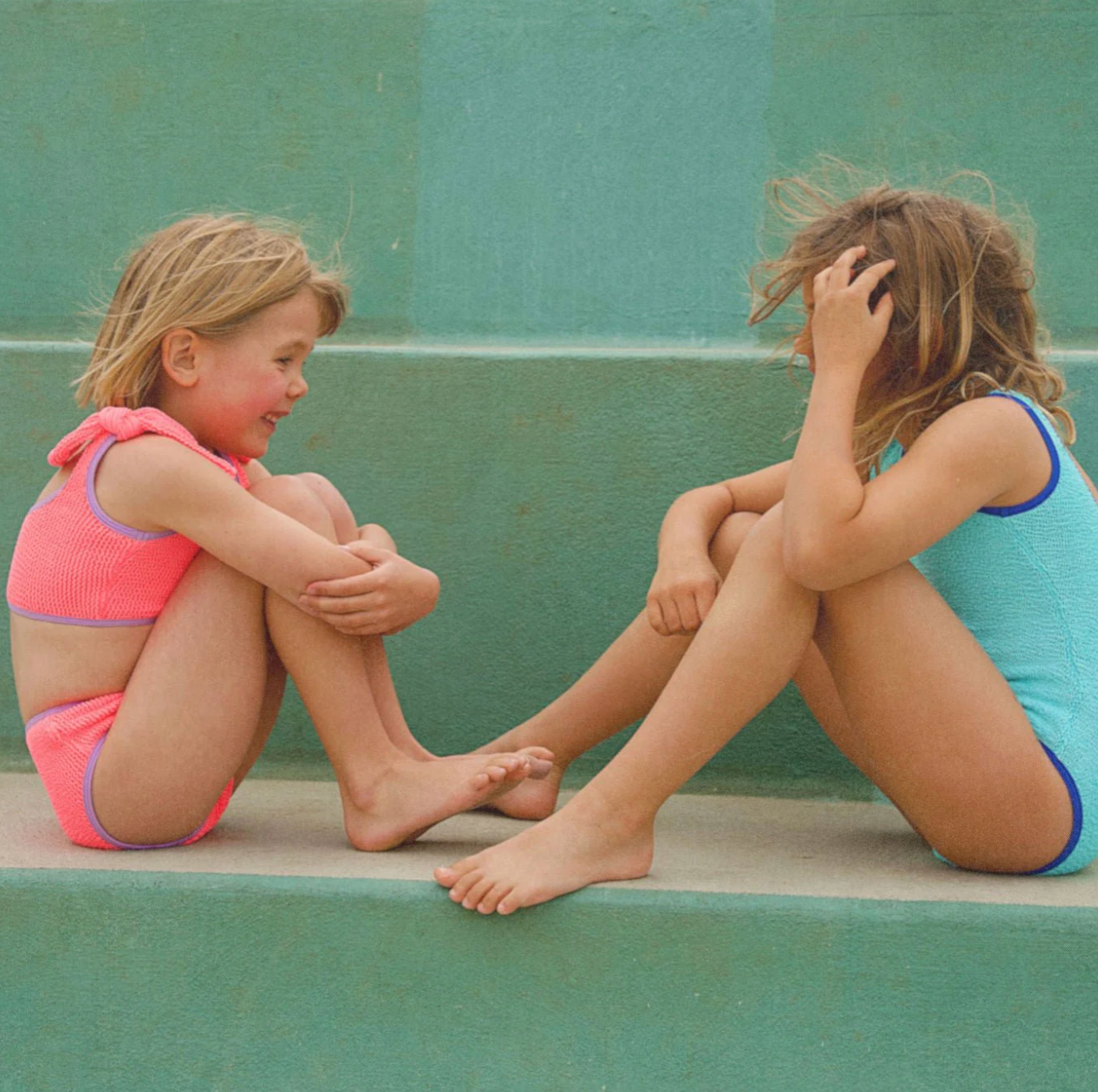 Make waves in the Golden Child Classic Crinkle Bikini, a fun throwback to 90s summers and carefree days in the sun. Finished in bold fluro pink with lilac trim, this playful two-piece captures the retro energy of poolside holidays and beach days.