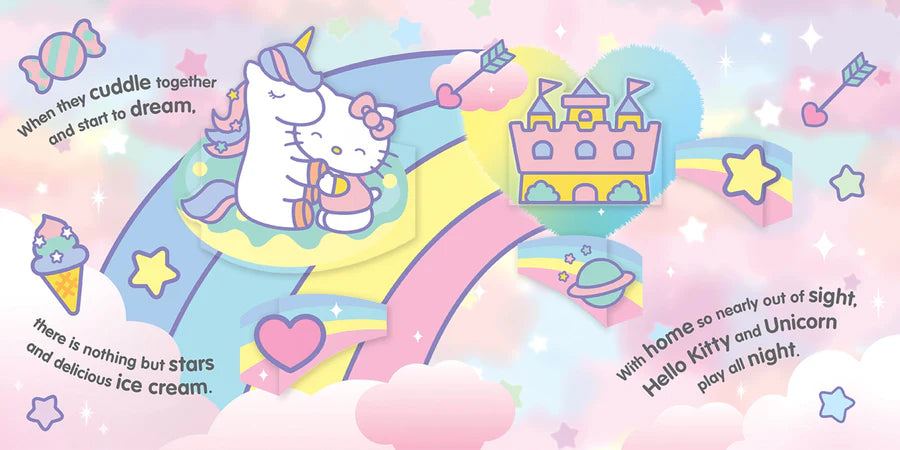 Join Hello Kitty and Unicorn for a dreamy journey through the clouds, with a beautiful pop-up scene on each spread. With sweet rhyming text, Hello Kitty and Unicorn roam through the stars from night to sunrise.