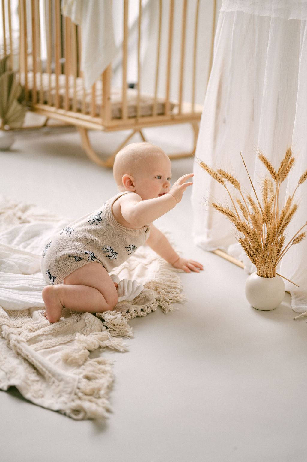 Made from all natural cotton, this soft knit romper features zebras all over, adjustable straps with coconut buttons and ribbed leg opening for a snug fit. 100% Natural cotton. Made in China. Wash according to care instructions.