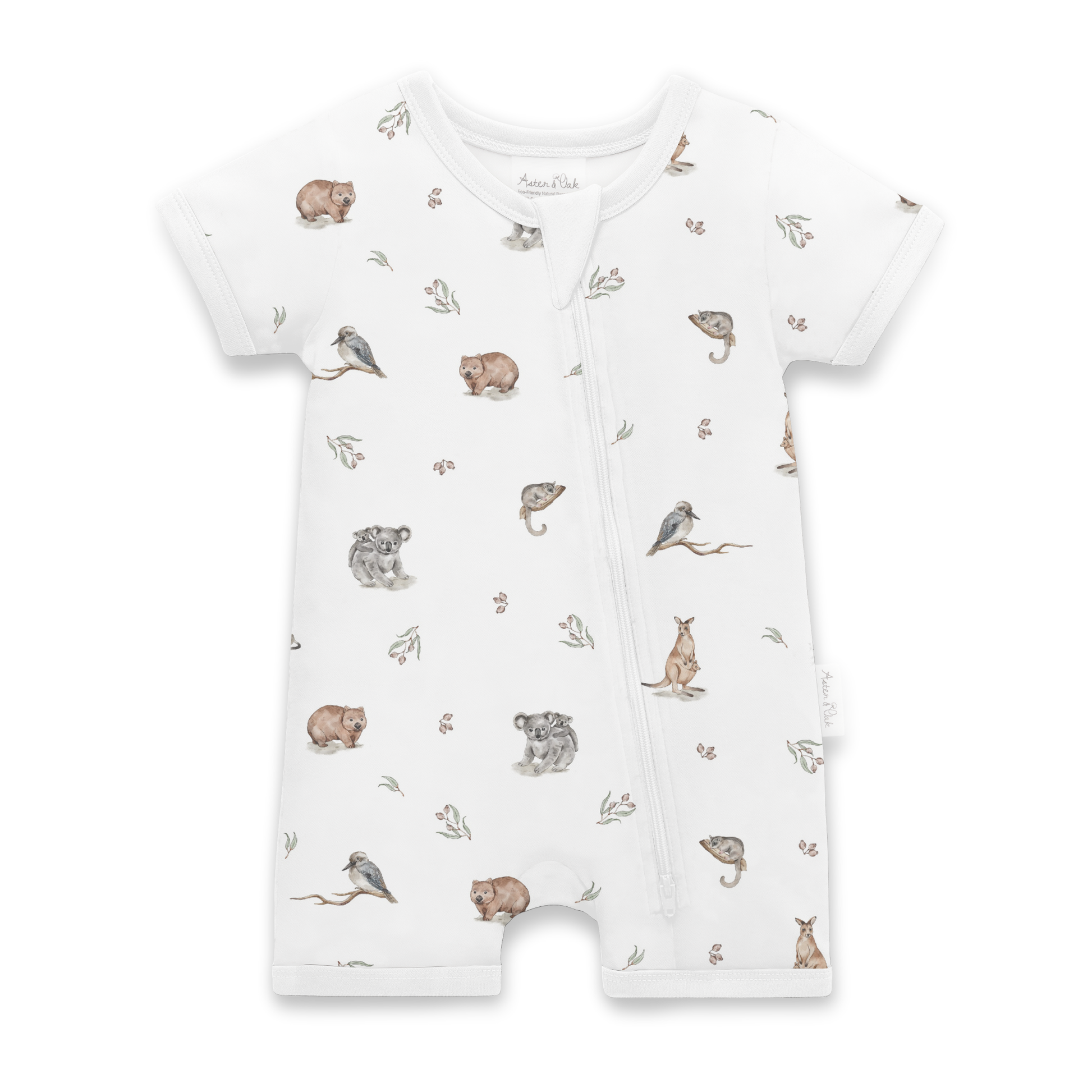 Made from GOTS certified organic cotton, the Native Animals Zip Romper features short sleeves and has premium YKK two way zippers with protective backing and zip cover. 100% Certified organic cotton #IDFL010505. Made in India. Wash according to care instructions.