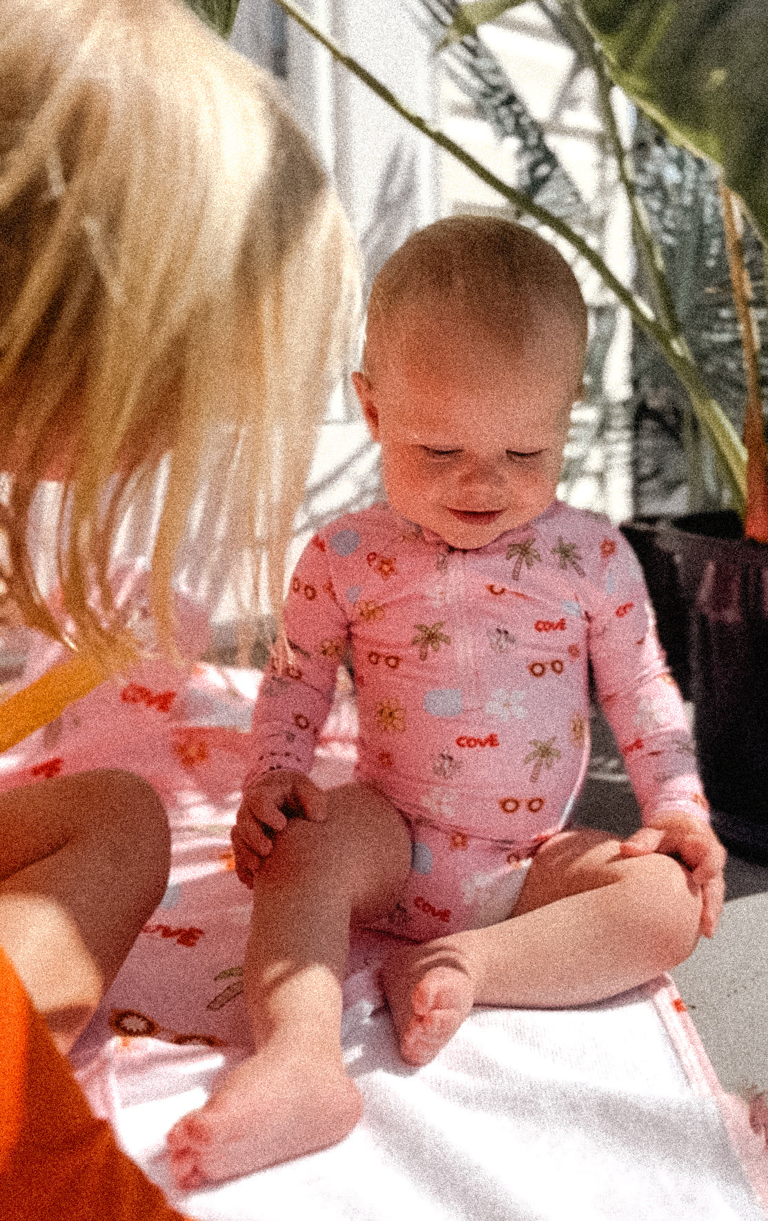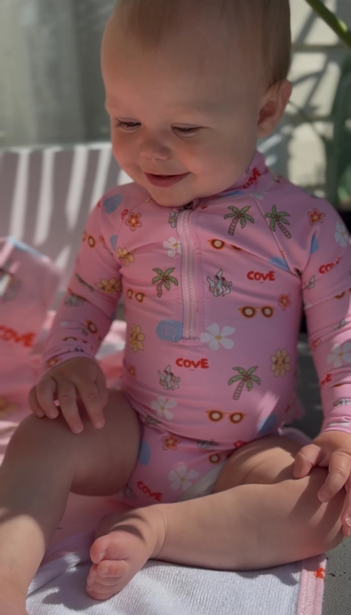 Let the good vibes roll with the Ocean Disco Girls Swimsuit! Bursting with retro daisies, palm trees, sunnies, and seashells, this long-sleeve zip-up swimsuit is all about sunshine fun and coastal adventures. Designed in a dreamy pink base, it’s a nod to vintage surf style with a groovy twist that your little disco queen will love.
