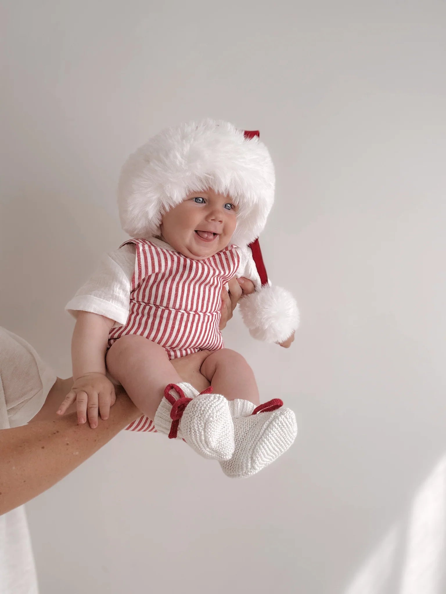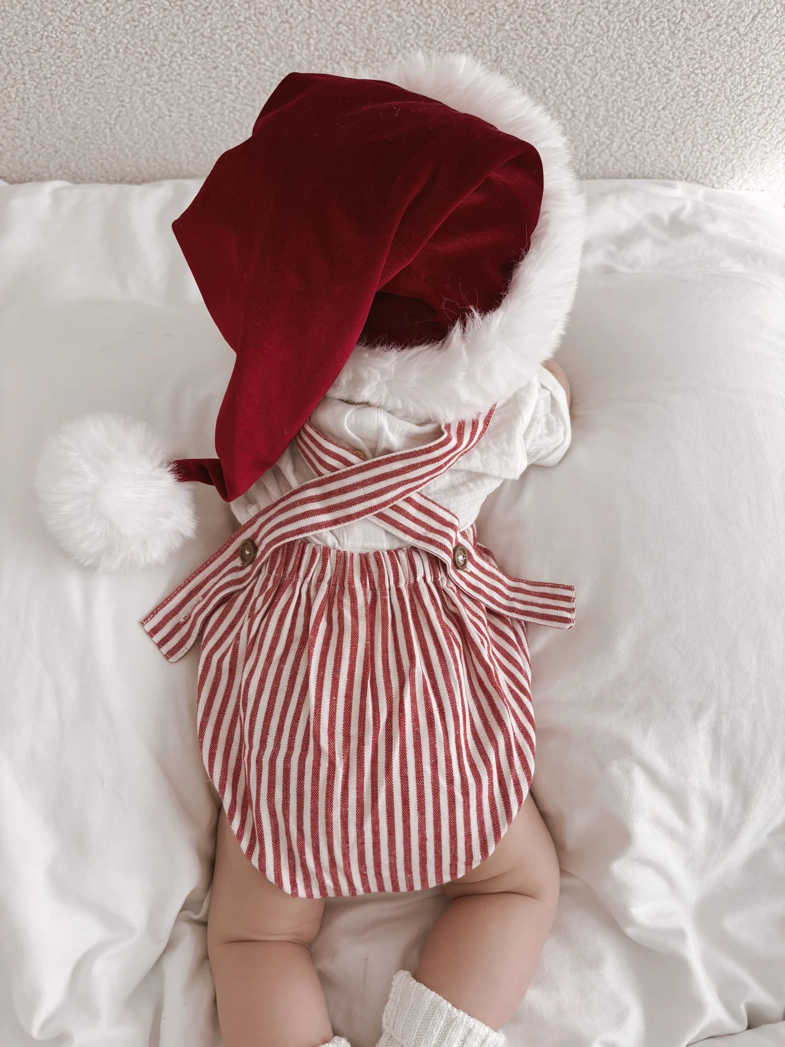 The new Candy Stripe Cross Back Romper is the perfect festive piece for your little love. With an adorable red stripe, and adjustable straps with wooden buttons, it is lightweight