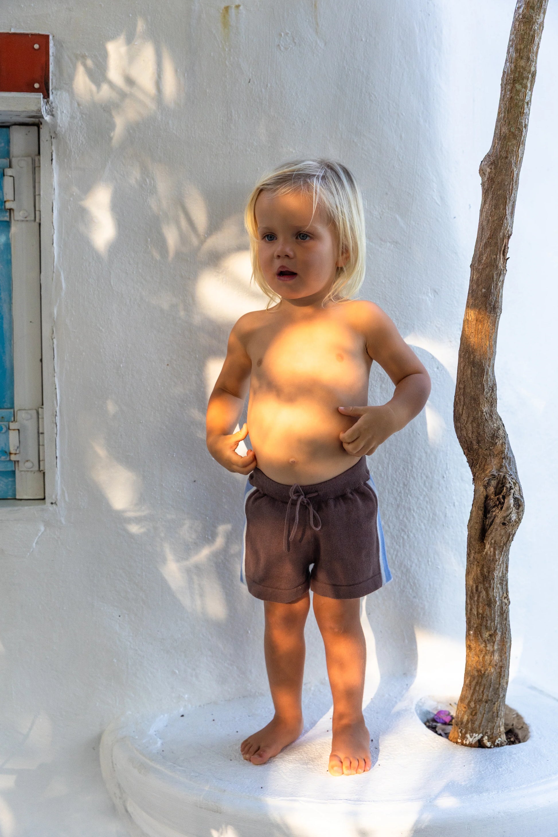 Adventure-ready and effortlessly cool. The Cove Mini Short features a relaxed fit, functional drawstring, and a fun blue side stripe. Perfect for play, beach days, or just keeping comfy in style.