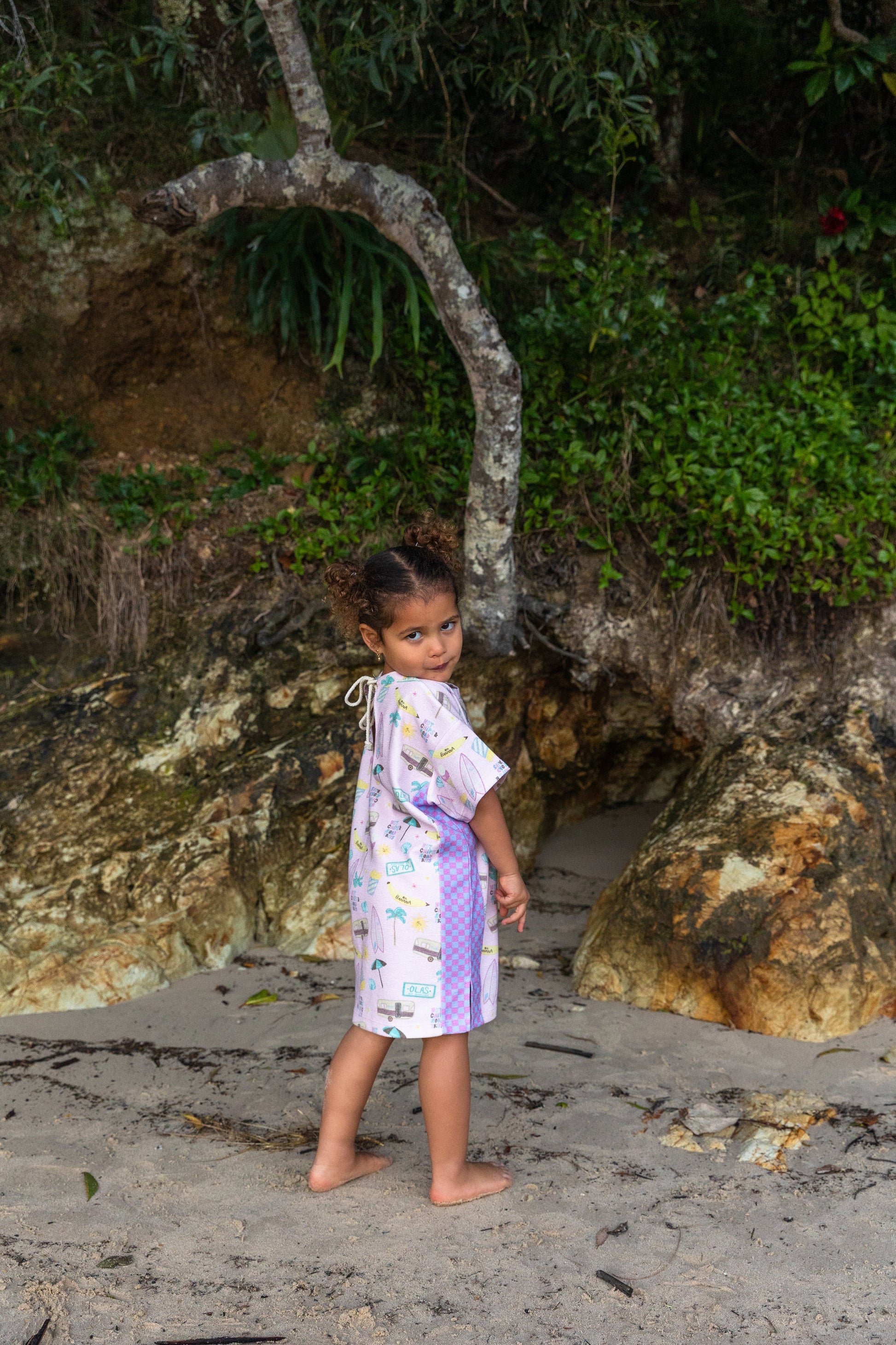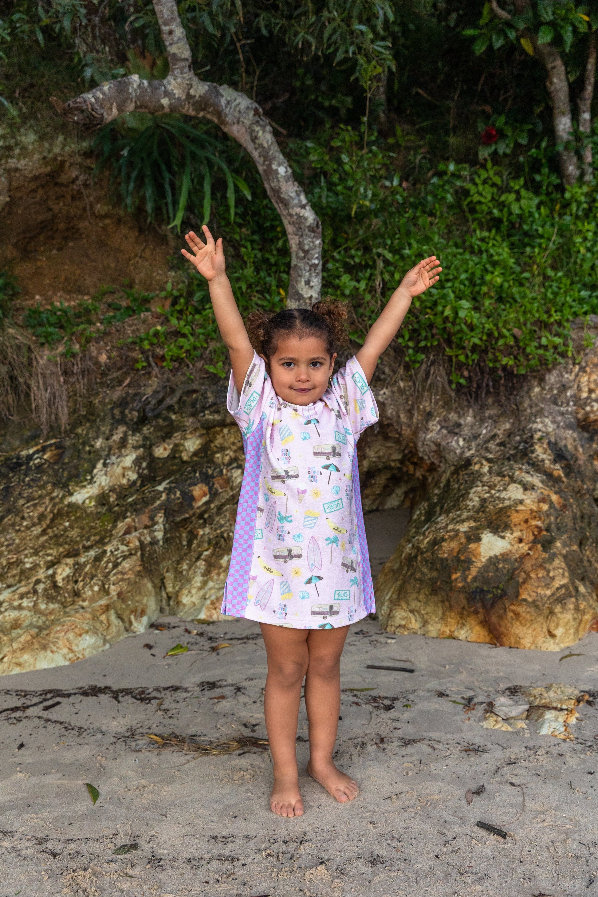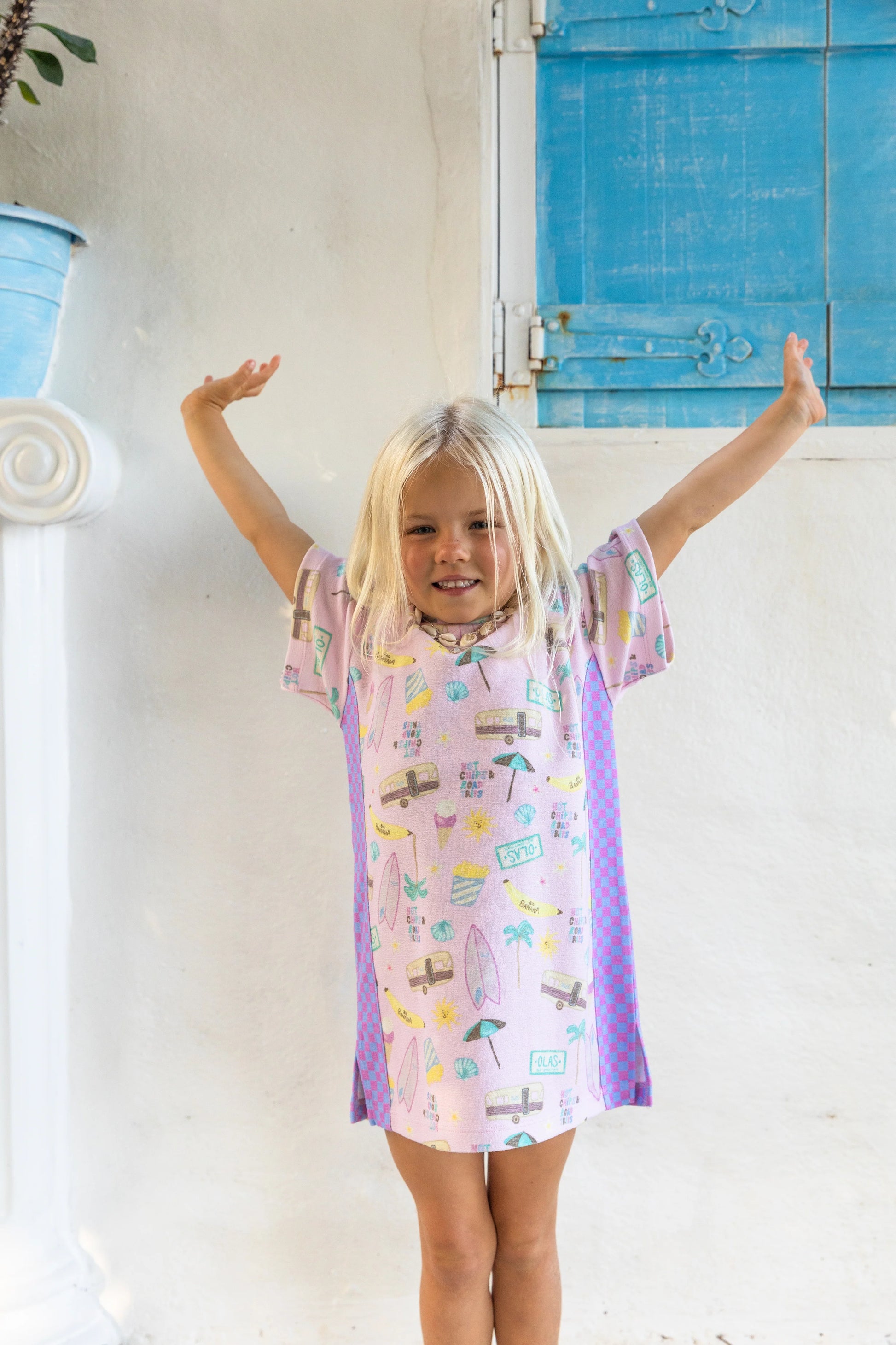 Sun, sand, and endless adventures. This dress features a playful beachy design and a tie-up back. Perfect for summer days spent exploring, playing, and chasing the horizon.