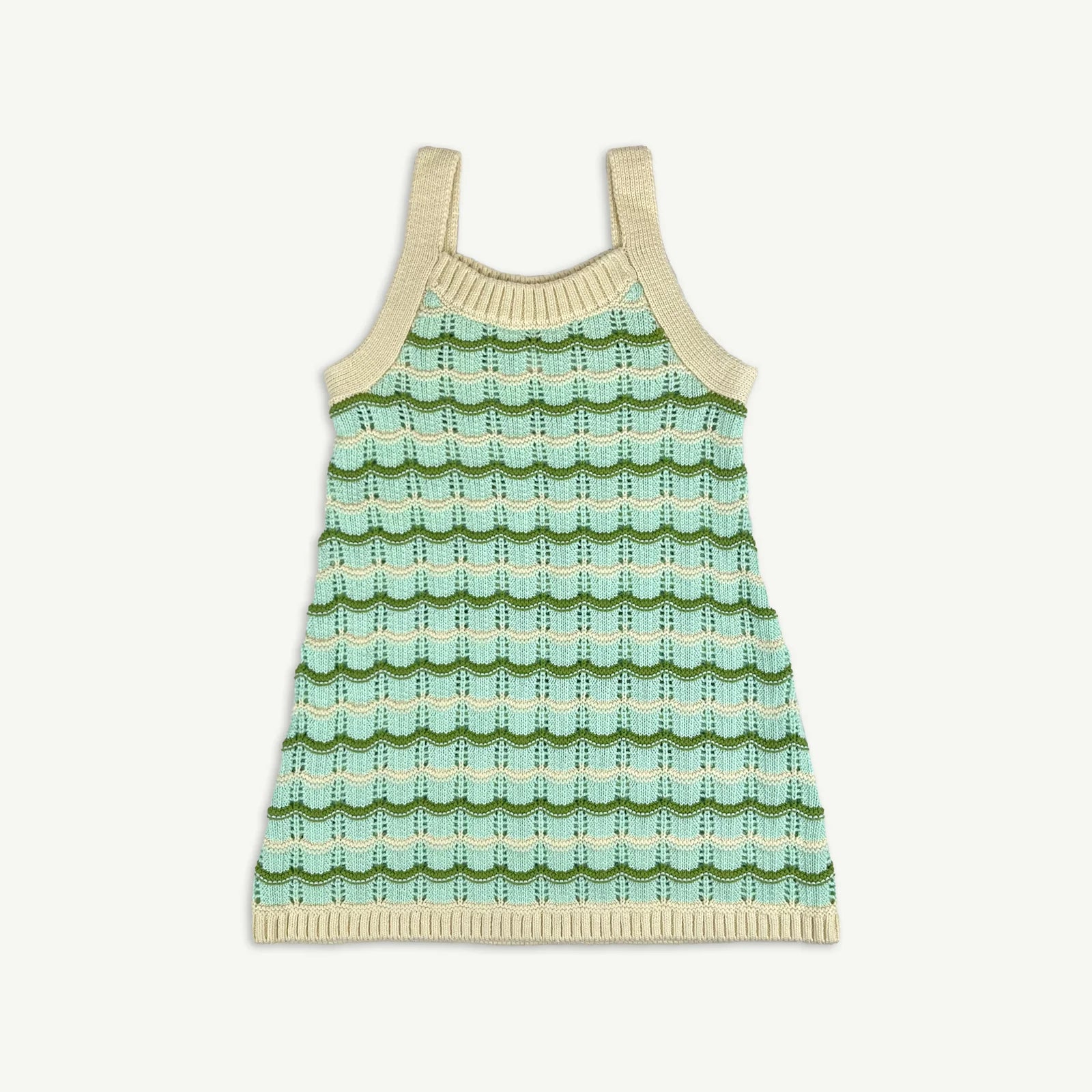 An easy, peasy and oh so dreamy dress for summer. This adorable pointelle wave knit shift dress is perfect for party season in minty fresh colours. Made from organic cotton it is comfy and breathable for wear all summer long.