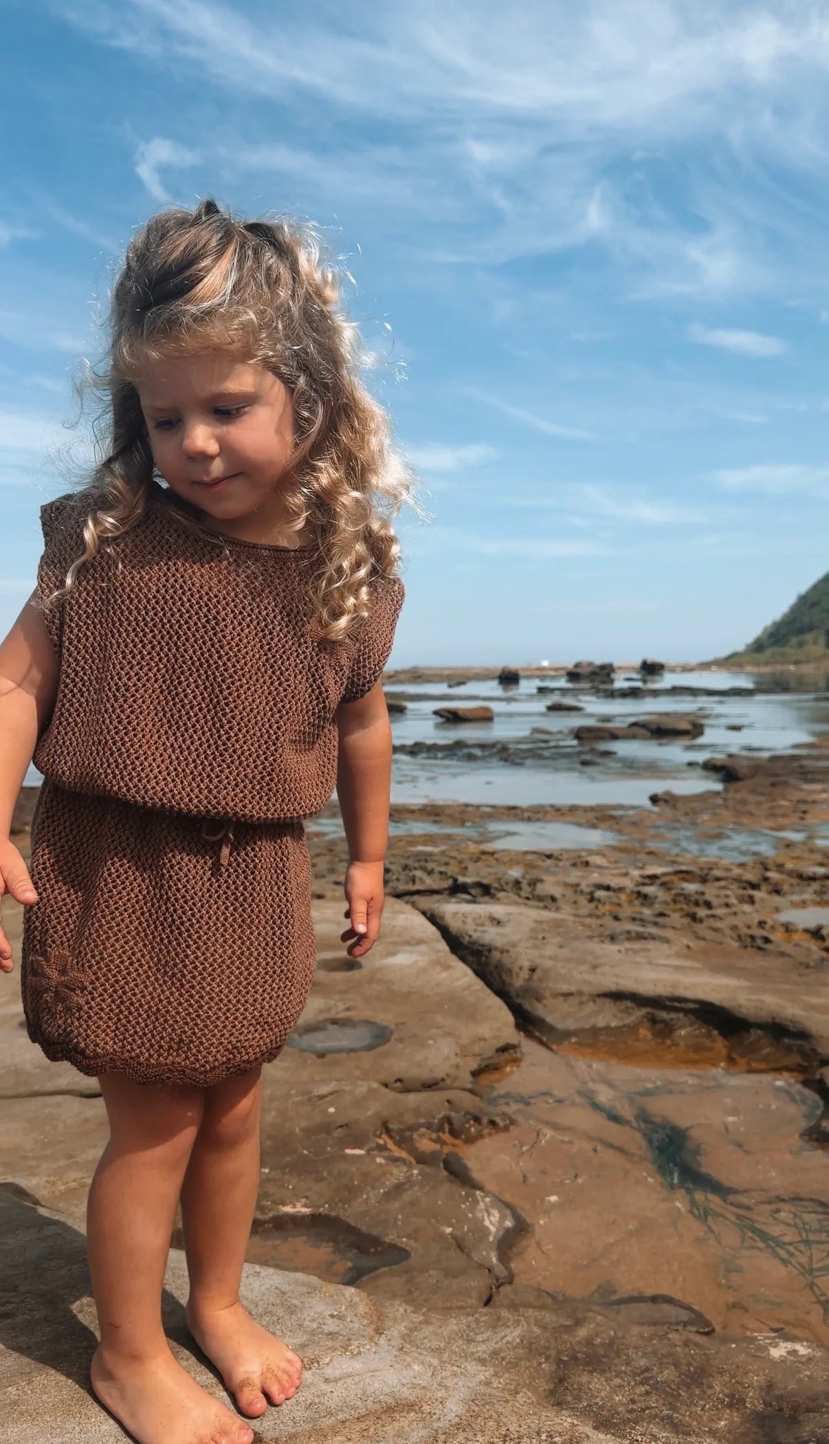 Crafted from 100% soft cotton, this lightweight knit dress is beautifully breathable and gentle on delicate skin. Featuring delicate flower detailing and a subtle wave-edge finish in a chocolate brown colour, it’s the perfect blend of sweet and coastal charm.