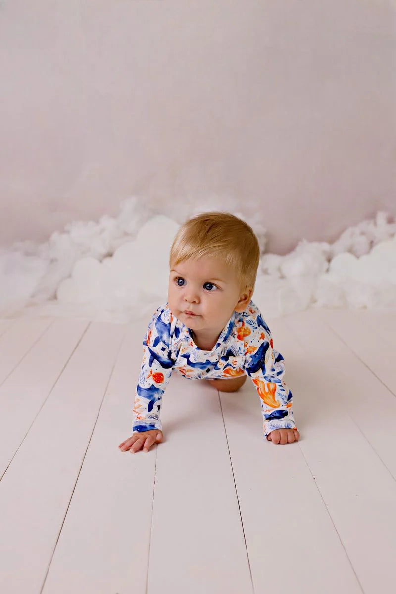 Swim Rashie Long Sleeve in Sea Symphony — a playful ocean inspired print with full-length sleeves for extra sun protection, made from soft, quick-dry fabric for carefree summer fun.