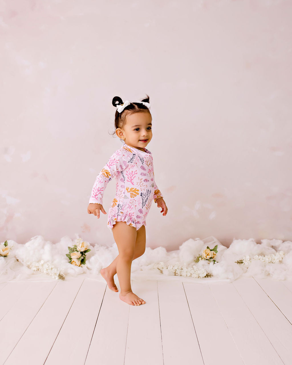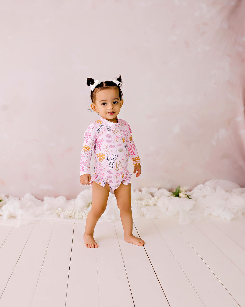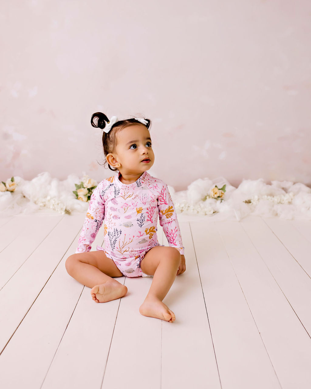 Swim Zippy Long Sleeve in Coral Reef — a bright, ocean-inspired print with full-length sleeves for added sun protection, crafted in quick-dry, comfy fabric for endless summer adventures.