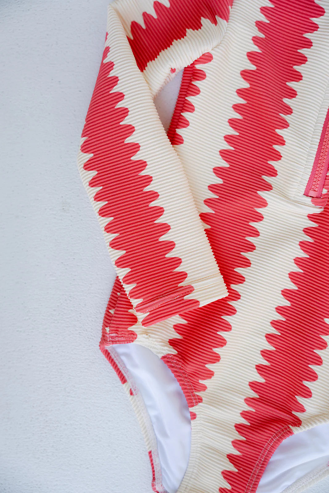 Get your little one ready for summer with this vibrant full-piece girls' swimsuit! Featuring a playful wobble watermelon stripe pattern, this swimsuit adds a splash of fun to pool or beach days. Crafted from high-quality, ribbed recycled material, it combines comfort with eco-friendliness.
