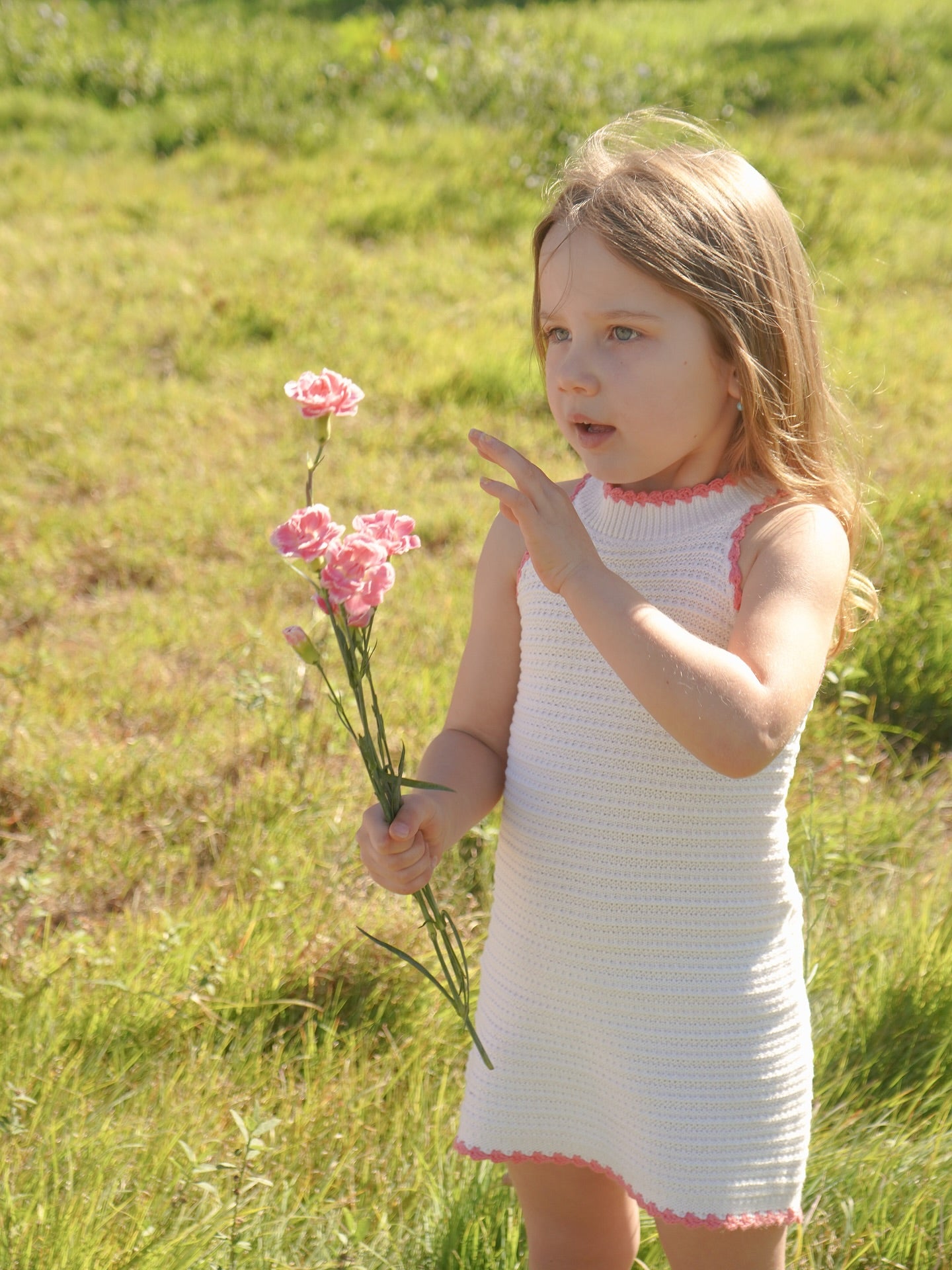 Meet the Kate Dress — your little one’s new “twirl-all-day” favourite! Made from super soft 100% cotton knit, it’s comfy enough for playground fun but cute enough for parties. The bright coral scalloped edges make it pop, while the breezy sleeveless shape keeps things cool on sunny days. Whether she’s running through the park, building sandcastles, or striking a pose, the Kate Dress is ready for every adventure.