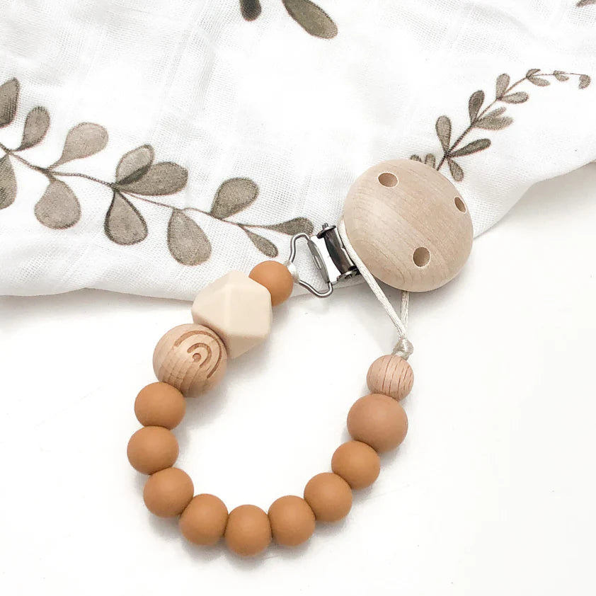 These Dummy Holders are made with non-toxic, food grade silicone and natural beech wood beads. The European made clip secures to clothing to keep dummy's close at hand. Fully compliant and independently tested to EN12586:2007 to meet safety standards, they're modern and practical for your babe.