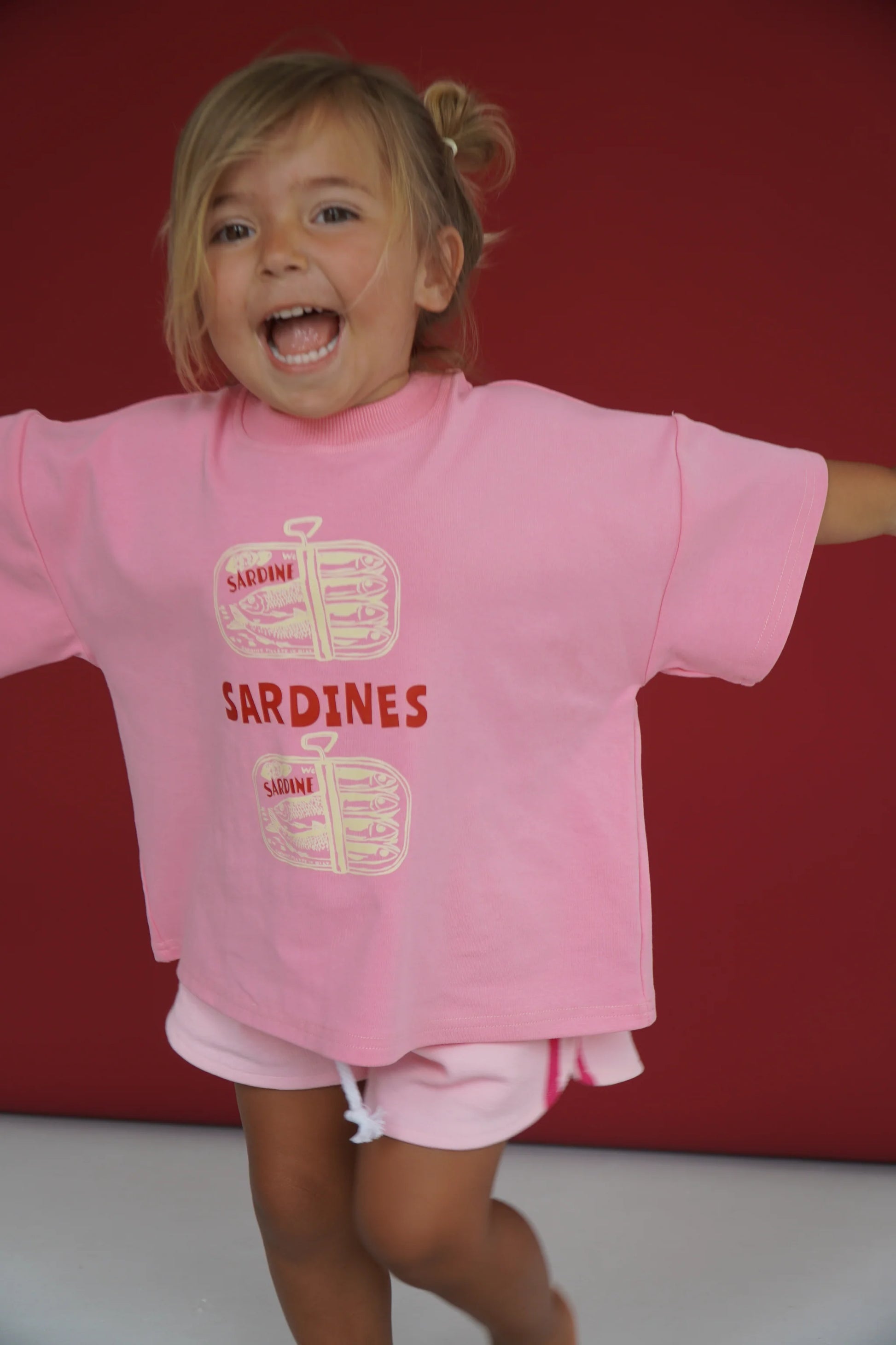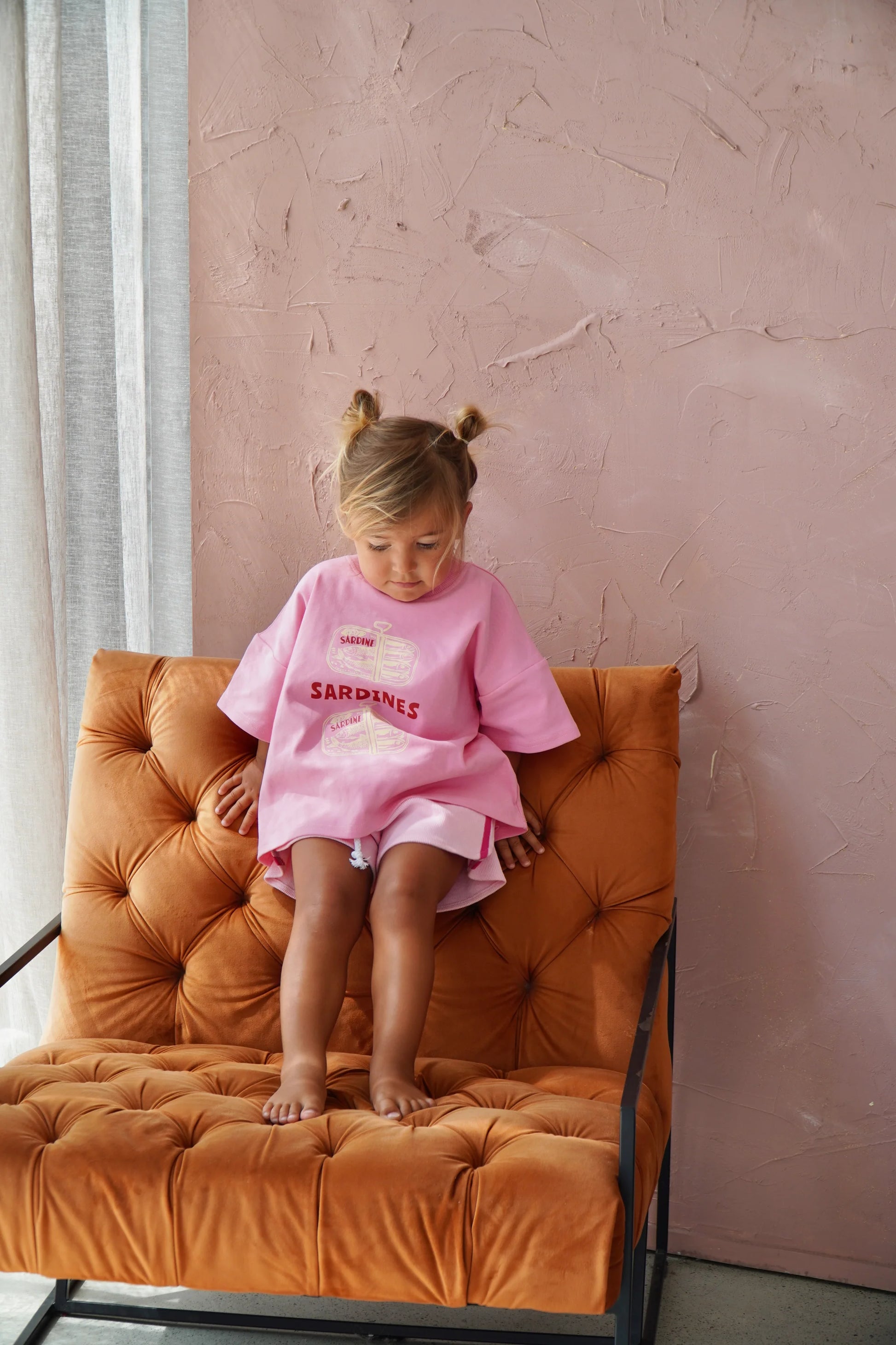 A pop of pink with a splash of cheeky charm! This bubblegum-bright tee serves up serious fun with its quirky sardine graphic. The perfect mix of cute, cool and a little bit silly. Soft, comfy and made for minis with big personality. 🐟💖